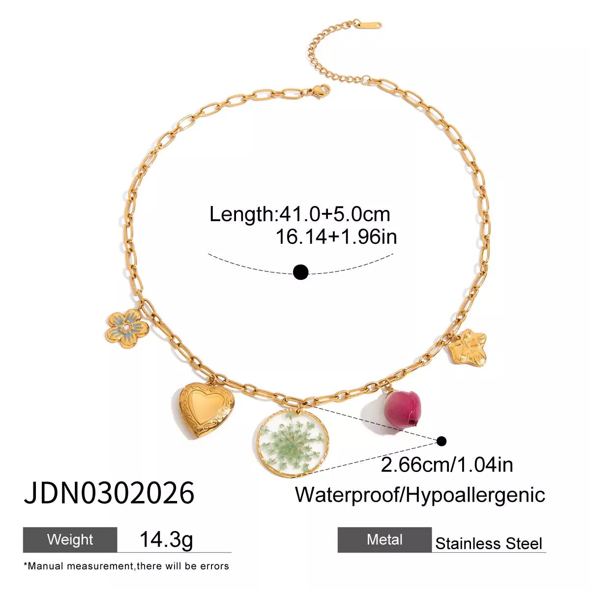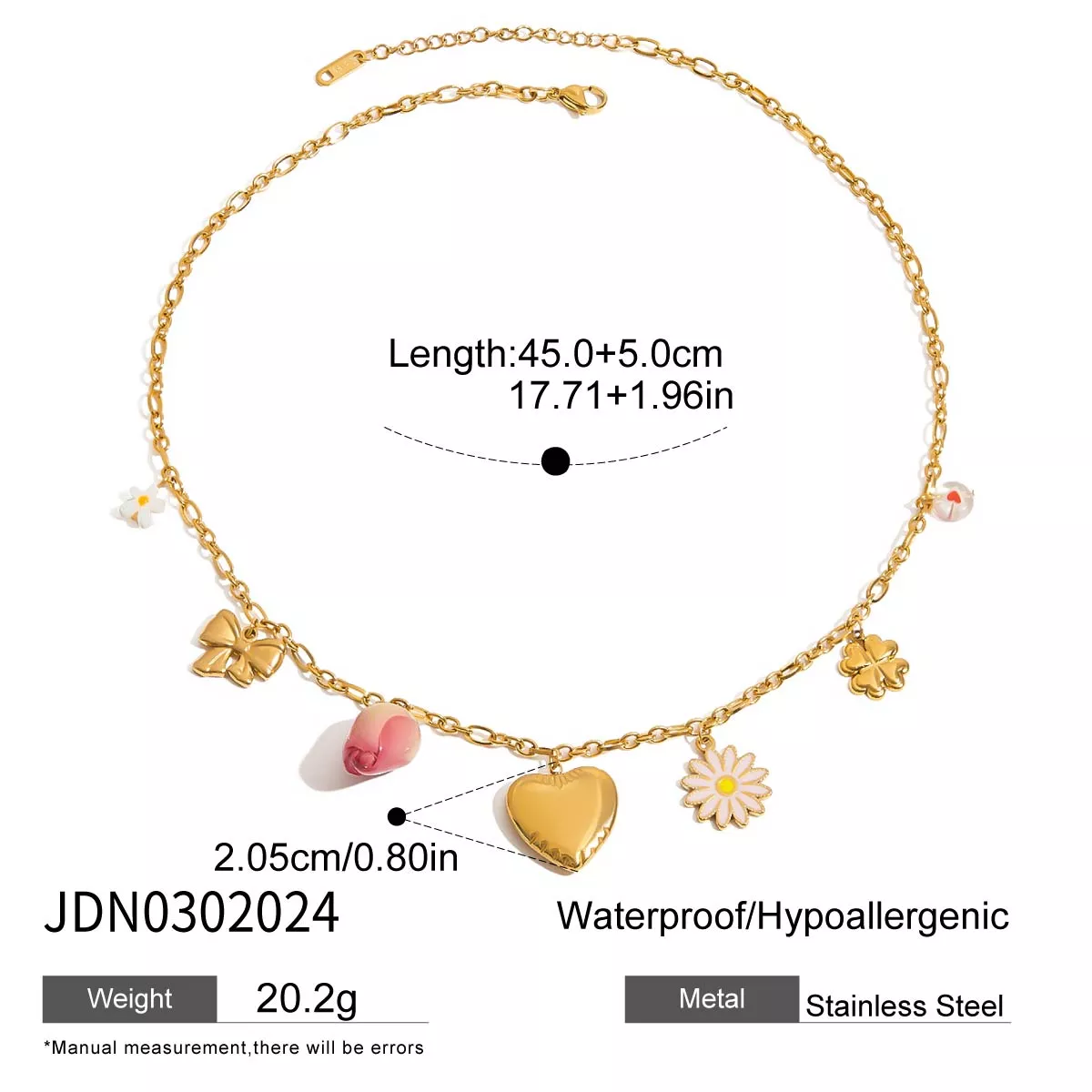 Let your accessories do the talking with this stunning 18K gold-plated heart charm necklace. Designed to capture the essence of summer and the spirit of vacation, this feminine piece features a delicate floral pendant set in a heart-shaped frame. Whether you’re strolling by the beach, dressing up for a garden party, or adding a soft golden glow to your everyday look, this necklace is your go-to piece for effortless charm and style.