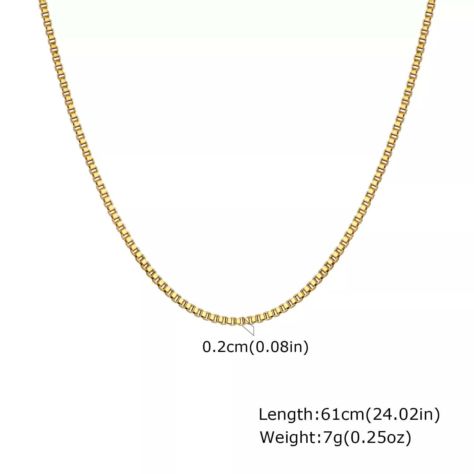 Upgrade your accessory game with this sleek and stylish 2mm Gold Square Box Chain Necklace, designed for both men and women. With its clean lines and polished finish, this stainless steel chain delivers a minimal yet impactful look that suits any outfit – whether you’re dressing up for a night out or adding a touch of class to your everyday wear.