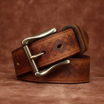 Thick Carved Genuine Leather Belt for Men – Vintage Copper Buckle Strap