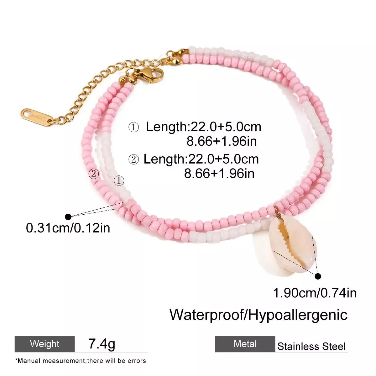 Boho Shell & Pink Beaded Anklet with 18K Gold Plated Stainless Steel