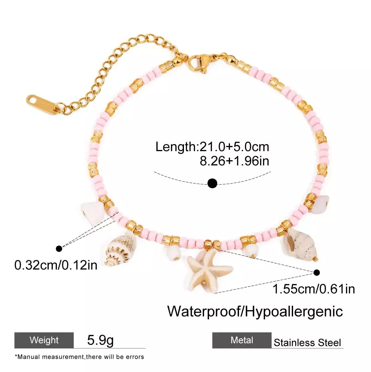With a soft palette of pinks contrasted against a natural shell pendant and sleek 18K gold plated stainless steel, it’s designed to bring out your inner free spirit while adding a refined, modern twist. This anklet is not only stylish, but made to last — with high-quality, tarnish-resistant materials that hold up to wear, water, and time.