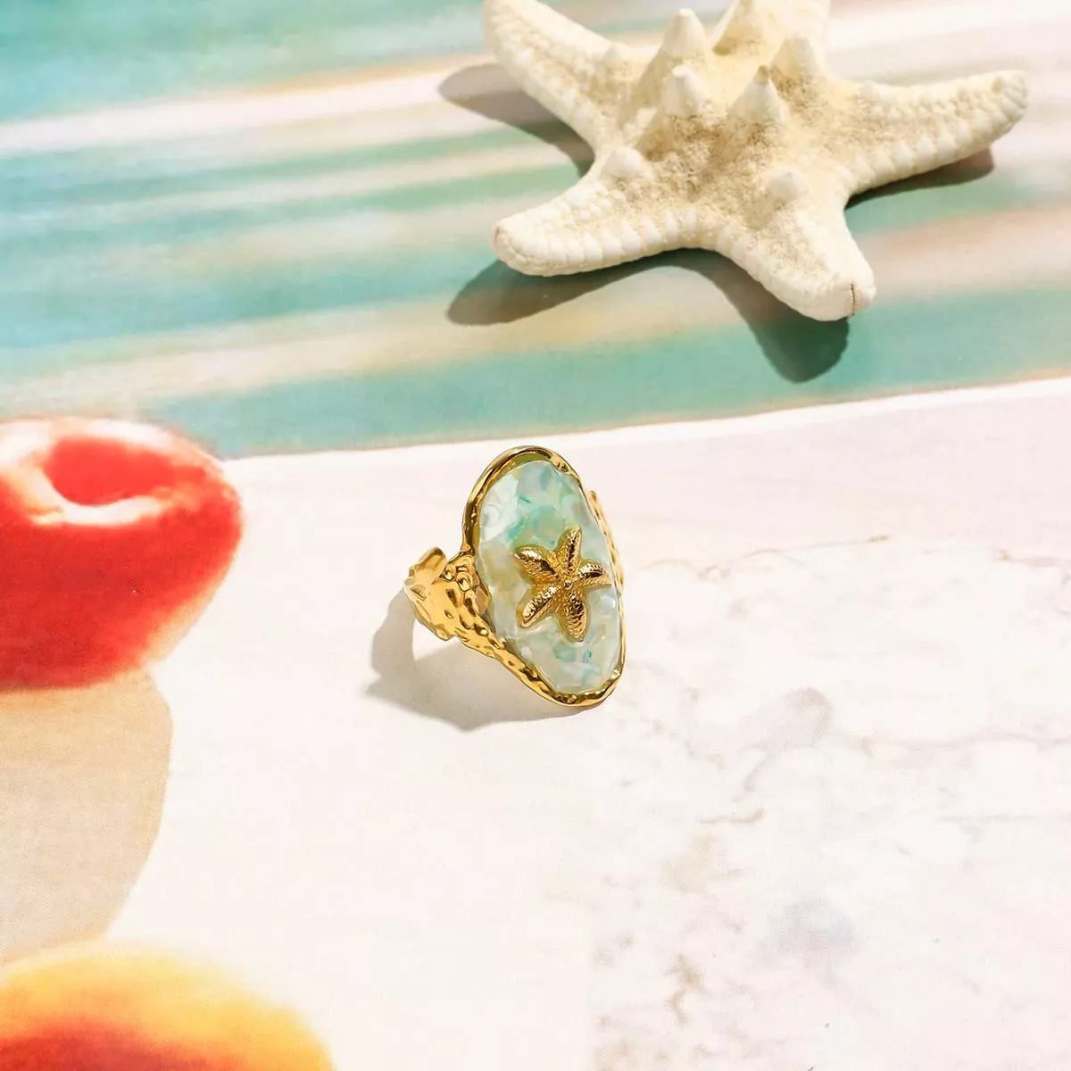 Boho Starfish Open Ring with Crushed Shell Inlay – 18K Gold-Plated Stainless Steel