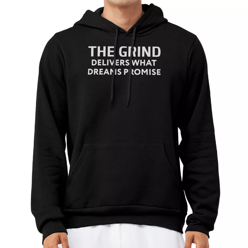 The Grind Delivers What Dreams Promise Hoodie – Work Hard Graphic Hooded Sweatshirt – Hustle Quote Unisex Hoodie