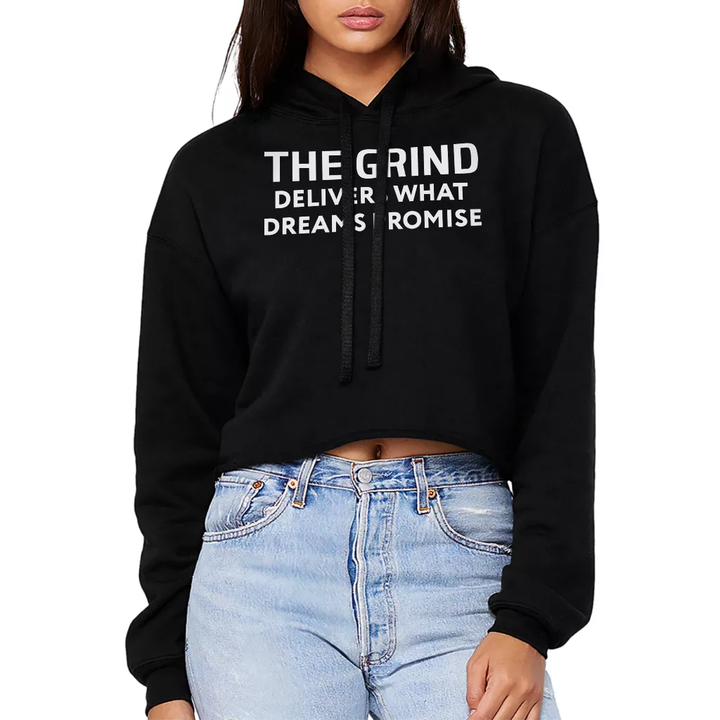 The Grind Delivers What Dreams Promise Women’s Cropped Hoodie – Hustle Quote Hooded Sweatshirt – Work Hard Graphic Super Crop Top Hoodies
