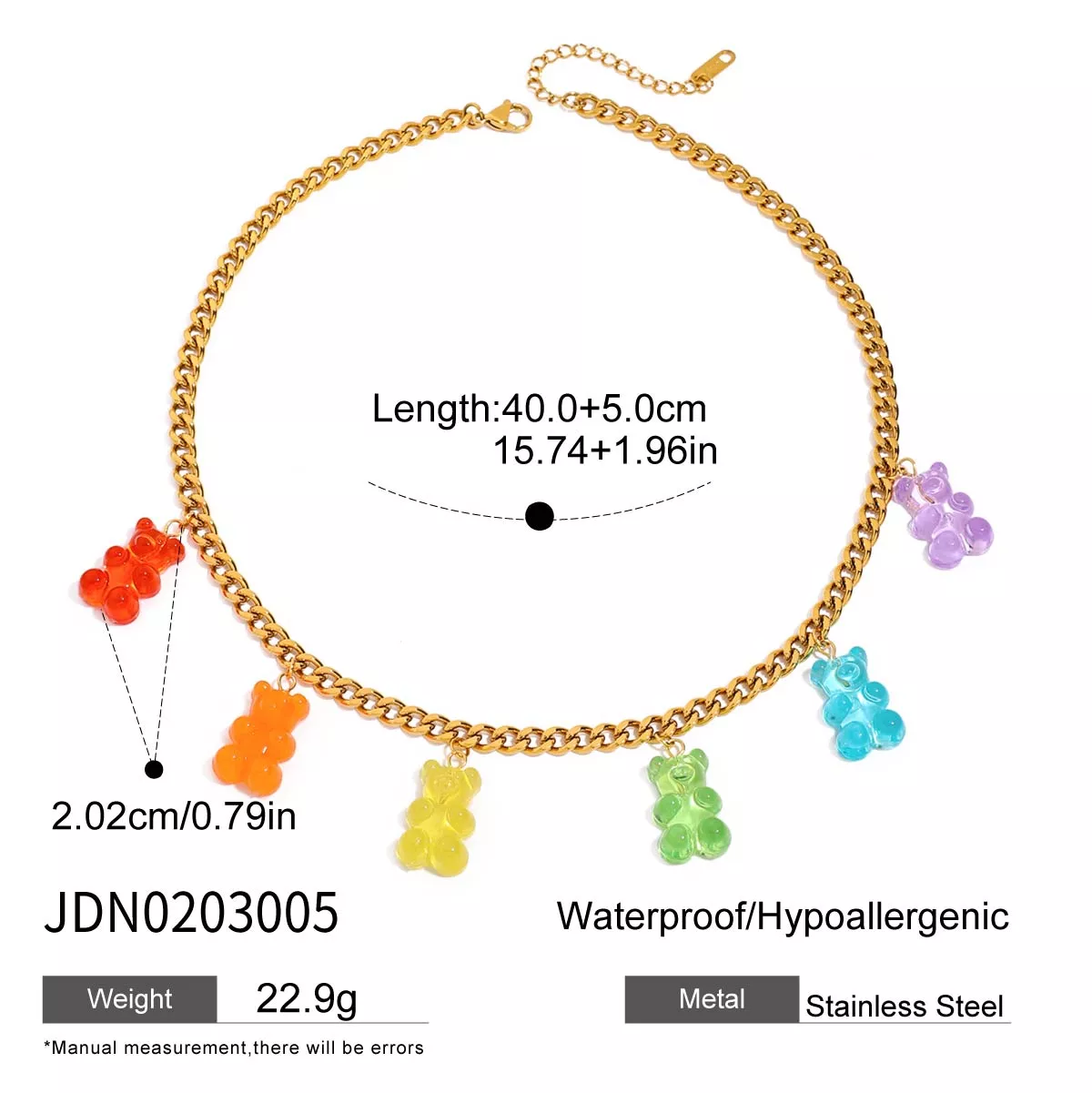 Brighten up your jewelry collection with this adorable and eye-catching Colorful Bear Pendant Necklace. Crafted with a fun and romantic twist, this necklace features a sweet multicolored bear charm suspended from a sleek 18K gold-plated stainless steel chain. Whether you’re layering it with your favorite pieces or wearing it solo, this necklace adds a burst of joy and color to any outfit.