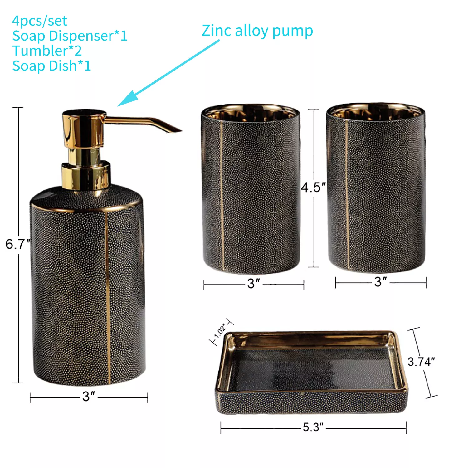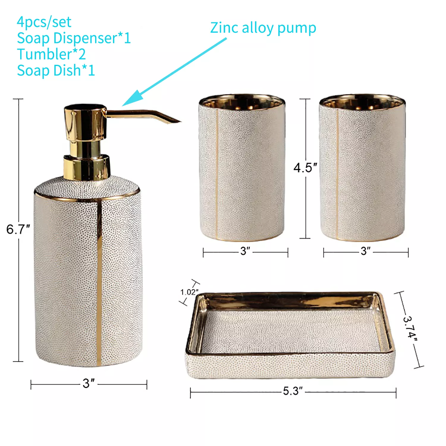 • Four-Piece Set: Includes a soap dispenser, two tumblers, and a soap dish to cover all your bathroom needs in one elegant set.