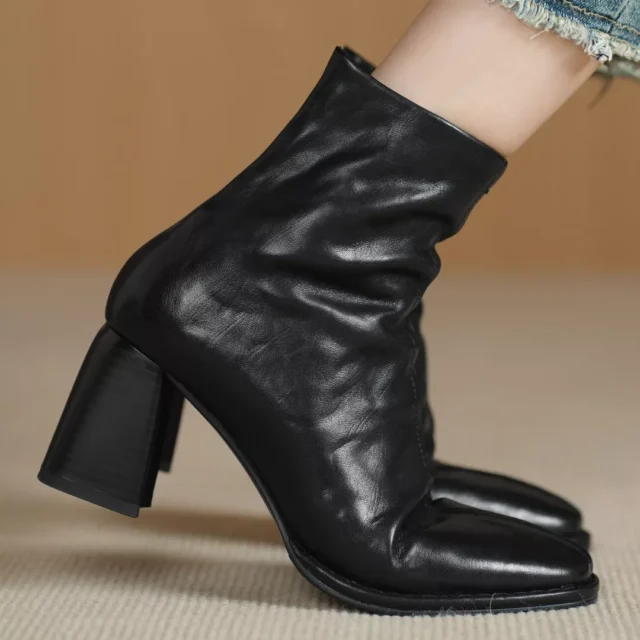 Elegant Women’s Pleated Leather Ankle Boots – 7cm Heel, Side Zip