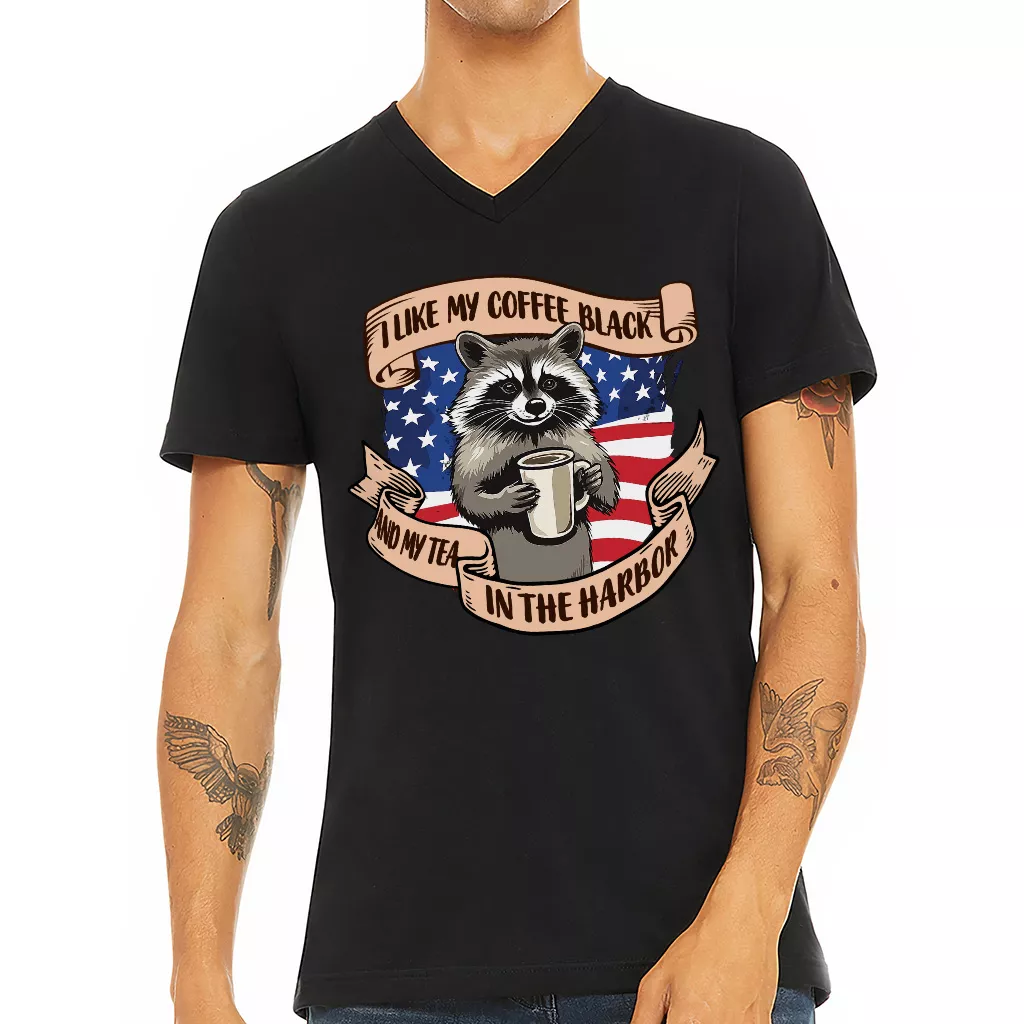 Tea in the Harbor V-Neck T-Shirt – Funny Raccoon Basic T-Shirt – Cool Quote Tee