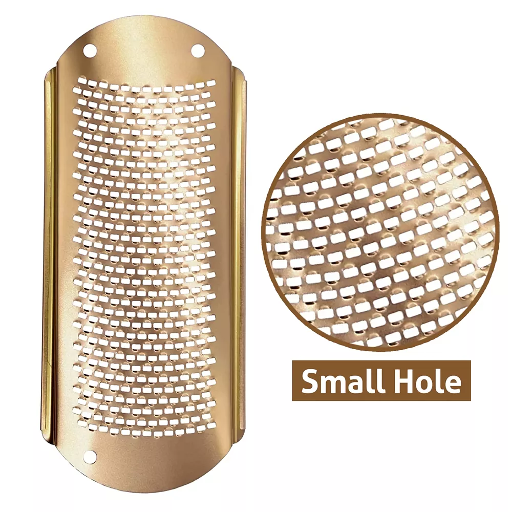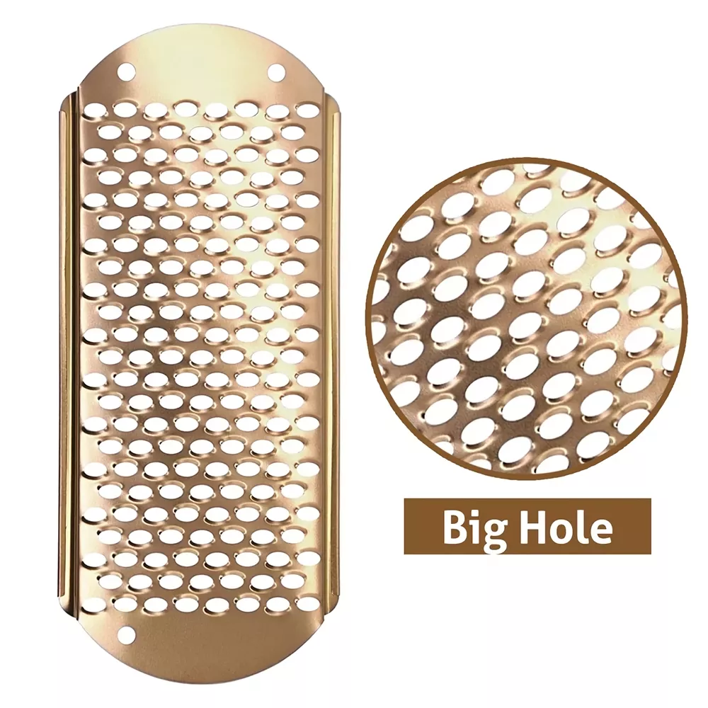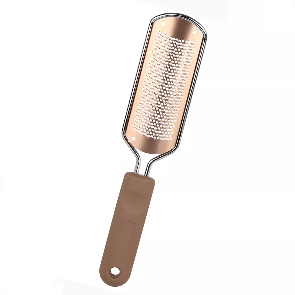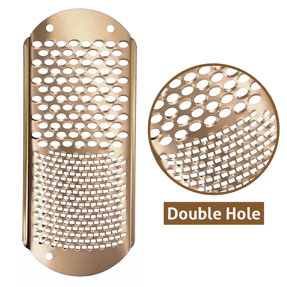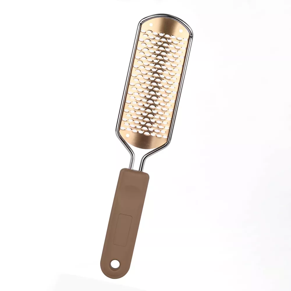 This foot file stands out due to its exceptional design and effectiveness. The stainless steel material ensures durability and longevity, while the elegant golden color adds a touch of luxury to your pedicure routine. The available hole options (big, small, or double) cater to different levels of exfoliation, making it versatile for all skin types. You’ll notice visible results after the first use, with the most stubborn calluses significantly reduced.
