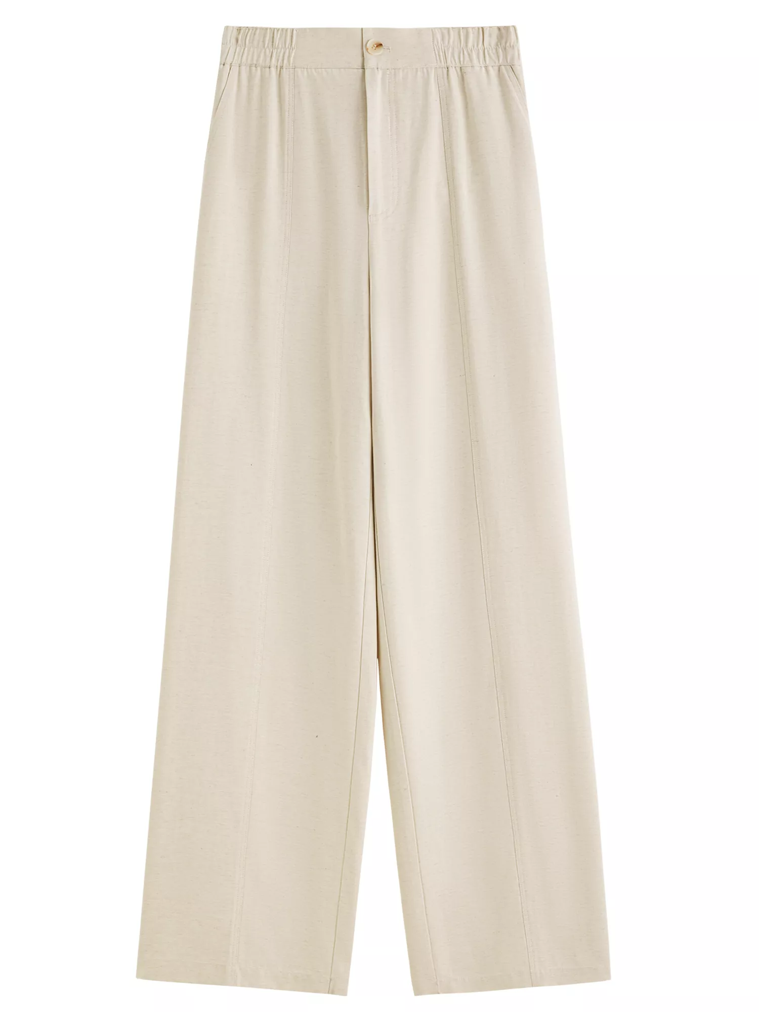 Crafted from a luxurious blend of linen, rayon, and polyester, the fabric is breathable yet structured, offering just the right amount of stretch for all-day comfort. The mid-rise waist and flat front design enhance a smooth, flattering fit, while the button-fly closure adds a touch of refined detail. With a straight, wide-leg cut that skims over the legs, these pants promise both freedom of movement and timeless style.