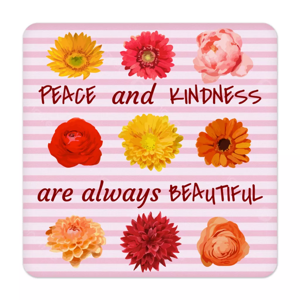 Peace and Kindness Are Always Beautiful Square Coaster 4-Piece Set – Floral Coasters for Drinks – Positive Thoughts Coffee Tea Mug Coasters