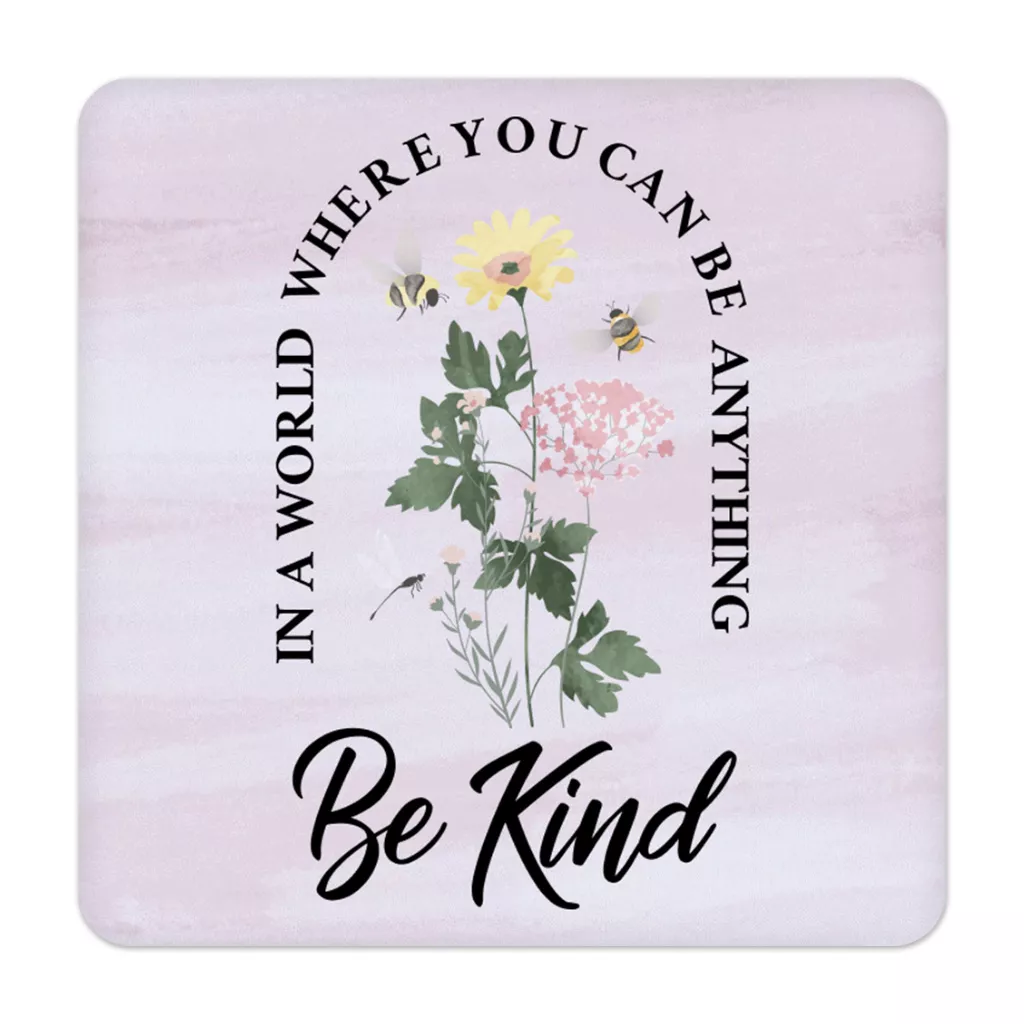 In A World Where You Can Be Anything Be Kind Square Coaster 4-Piece Set – Cute Flowers Coasters for Drinks – Wildflowers Coffee Tea Mug Coasters