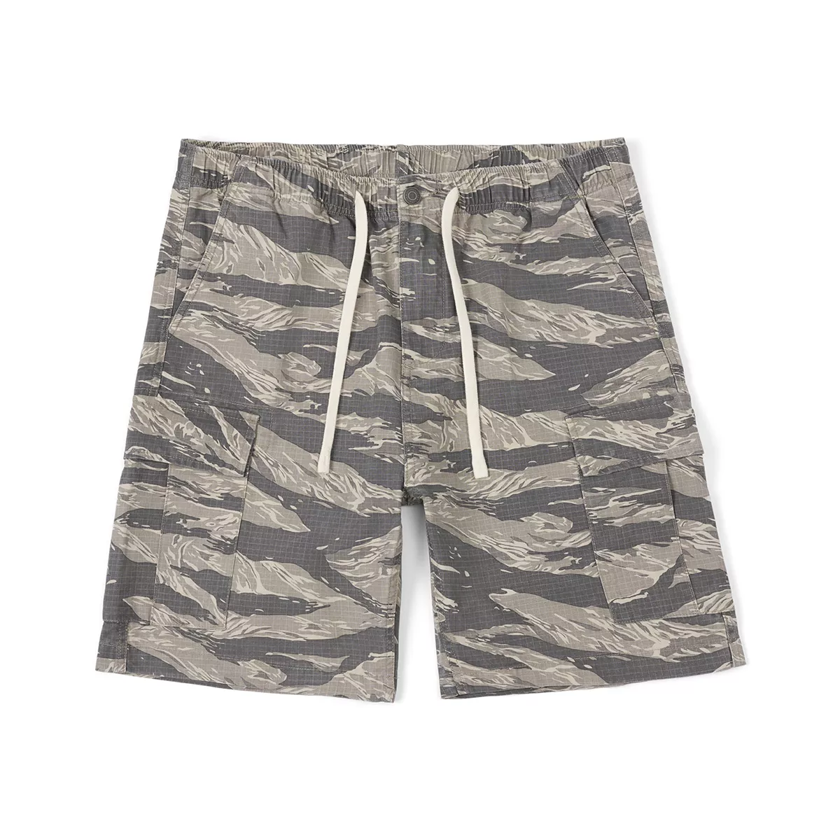 The loose-fit silhouette provides a relaxed and comfortable feel, while the mid-rise waist and classic zipper fly offer a secure and familiar fit. Featuring a subtle vintage camouflage pattern, these shorts channel a rugged outdoor vibe with timeless appeal. The high-quality 270gsm cotton fabric gives them a sturdy yet broken-in feel, making them perfect for everyday wear in spring and summer.