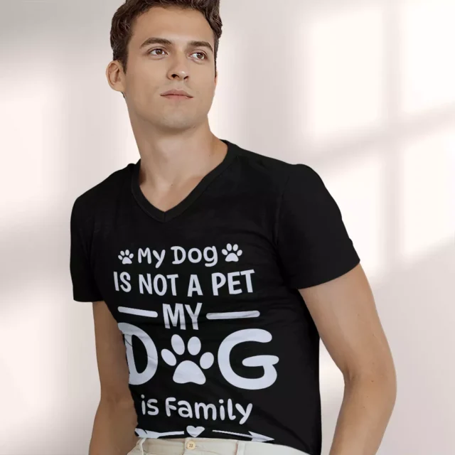 My Dog Is Not a Pet My Dog Is Family V-Neck T-Shirt is proudly made with 7x less water than average manufacturers, in recycle-friendly facilities that also guarantee zero sweatshop conditions