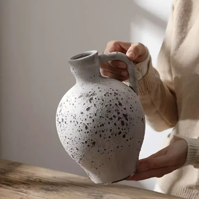 Transform your living space with this retro-inspired handmade ceramic vase. Its nostalgic charm and artisanal finish make it more than just a vase—it’s a statement piece that adds warmth and character to any room. Designed with a stylish handle, it blends practicality with visual appeal, offering a touch of old-world charm that never goes out of style.