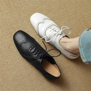 Women’s Genuine Leather Lace-Up Loafers with Brogue Design – Round Toe Flats