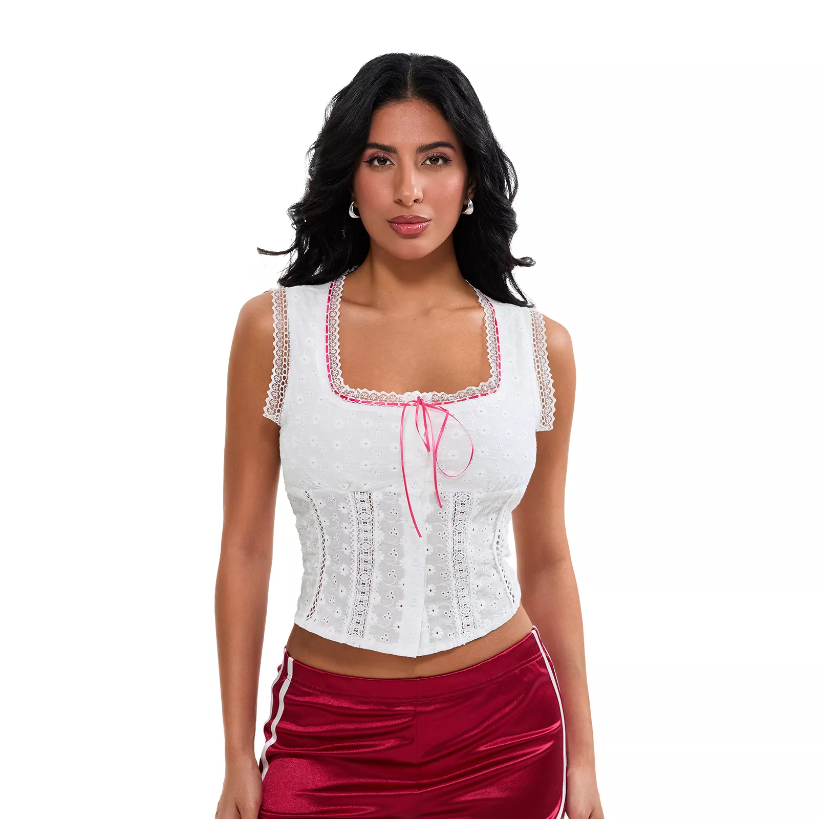 Sleeveless Square Neck Eyelet Tank Top with Lace Detail – Summer Button Front