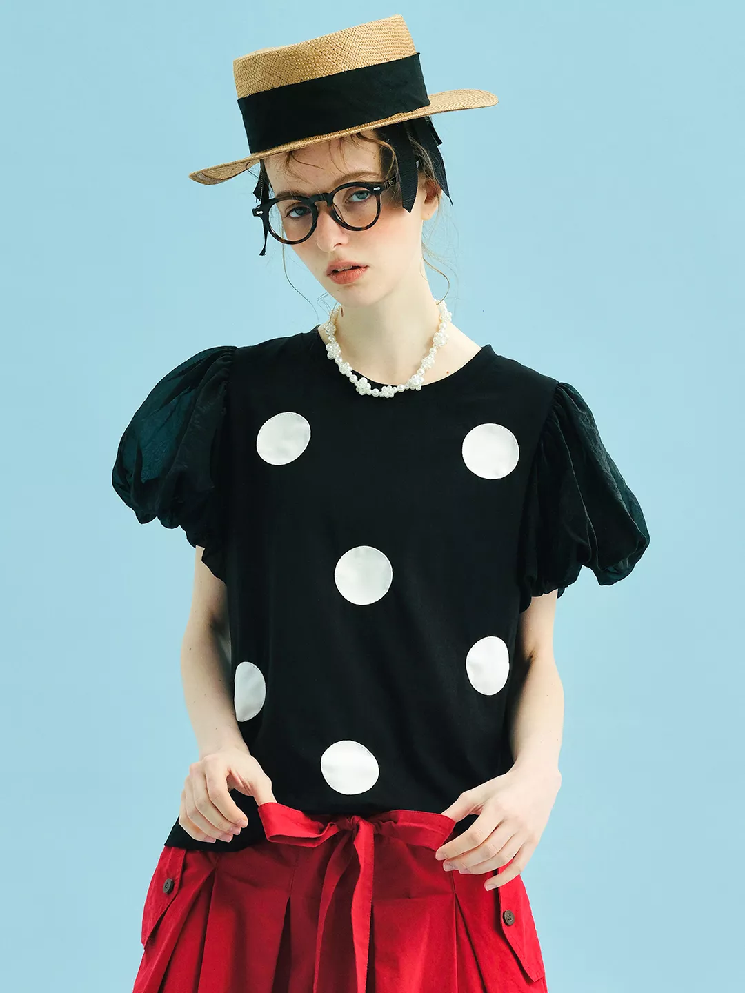 Step into summer with effortless style in this charming polka dot mesh lantern sleeve tee. Designed to bring together comfort and trend-forward fashion, this top is your go-to choice for warm-weather commutes, casual outings, or a relaxed day at home. With its round neckline and soft cotton-spandex blend, it offers a light, breathable feel that keeps you fresh all day long. The playful puff sleeves and delicate mesh detail add a whimsical touch, making it more than just your average T-shirt.