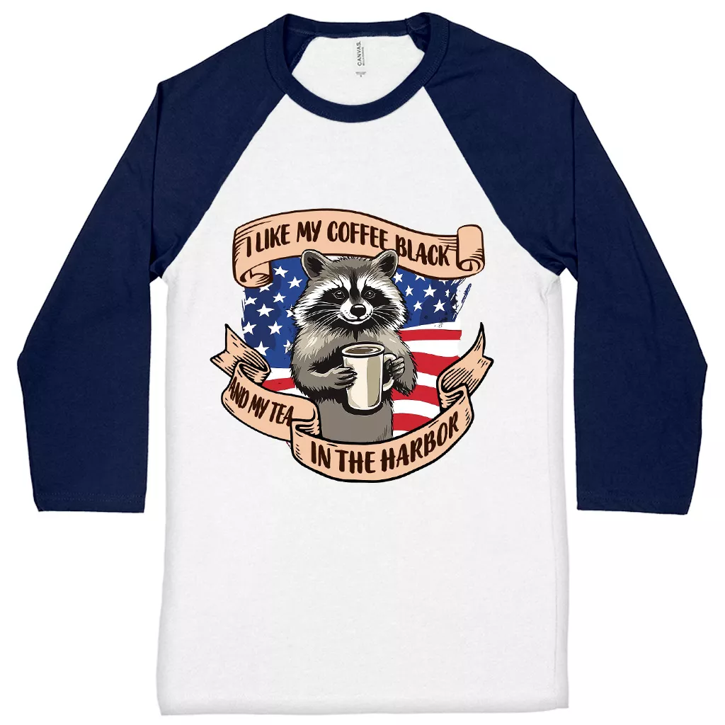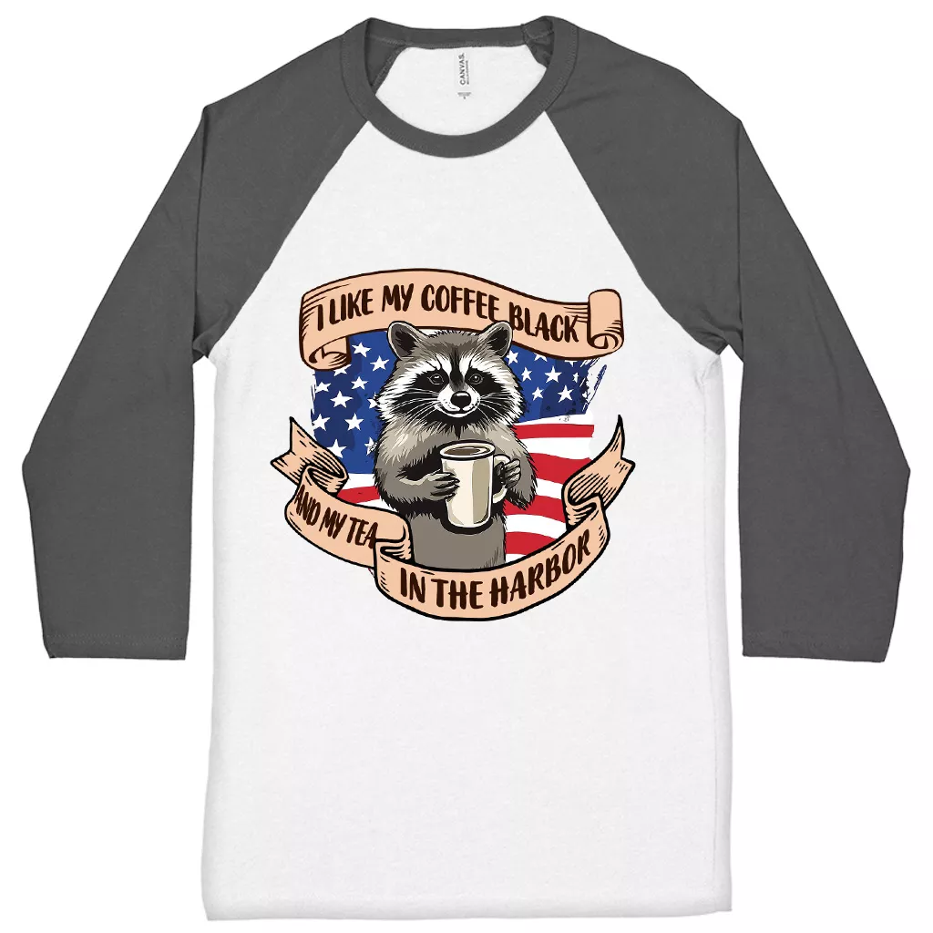 Tea in the Harbor Baseball T-Shirt – Cool Quote 3/4 Sleeve – Funny Raccoon Raglan Jersey Shirt