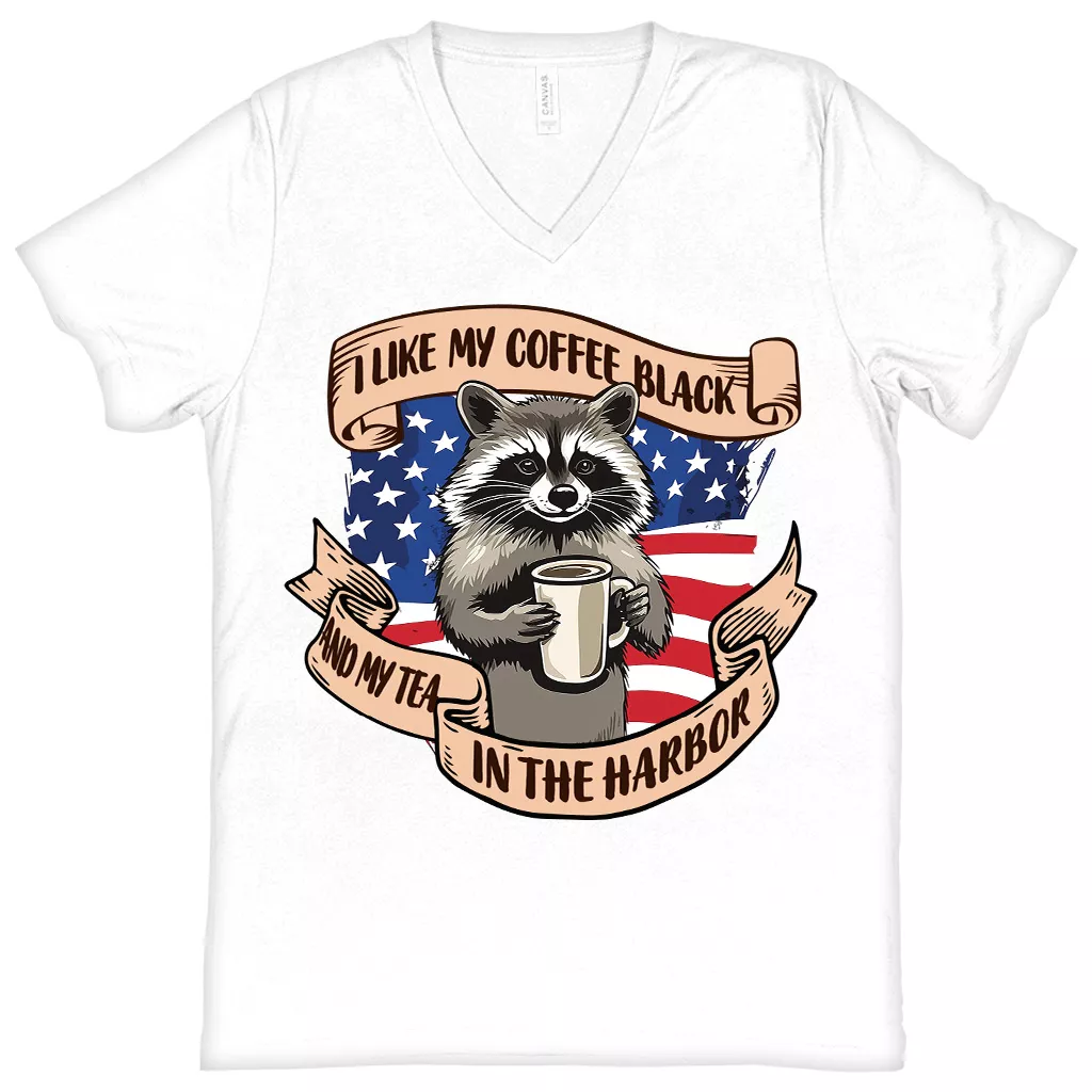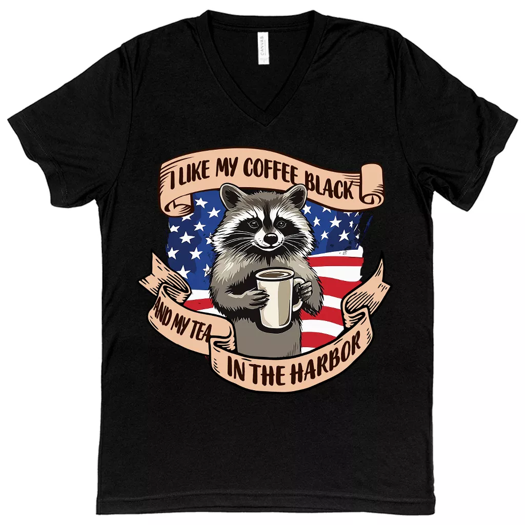 Tea in the Harbor V-Neck T-Shirt – Funny Raccoon Basic T-Shirt – Cool Quote Tee