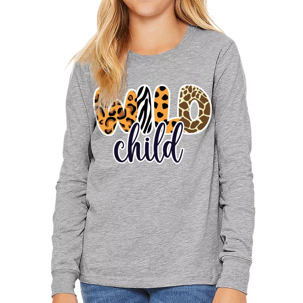 Wild Child Kids’ Long Sleeve T-Shirt – Retro Boho T-Shirt for Kids – Animal Print Tee for Boys Girls