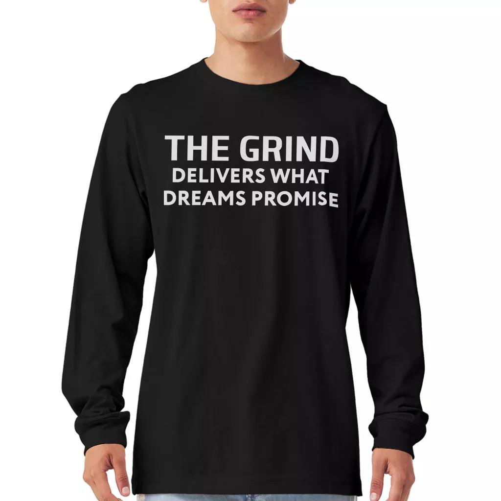 The Grind Delivers What Dreams Promise Long Sleeve T-Shirt – Work Hard Graphic T-Shirt – Hustle Quote Basic Tee