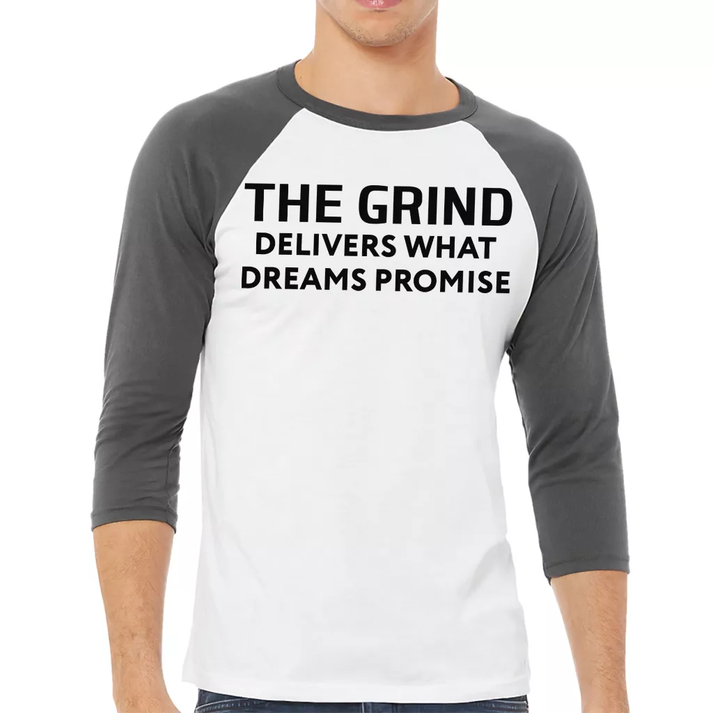 The Grind Delivers What Dreams Promise Baseball T-Shirt – Hustle Quote 3/4 Sleeve – Work Hard Graphic Raglan Jersey Shirt