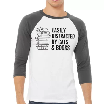 Easily Distracted By Cats And Books Baseball T-Shirt – Cats and Books 3/4 Sleeve – Book Lover Raglan Jersey Shirt